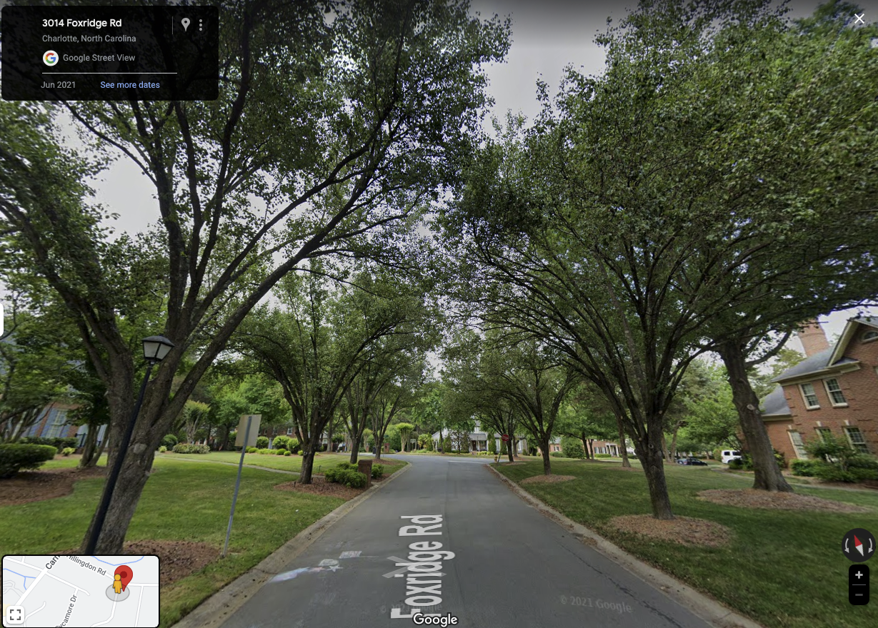 An image from Google Street View shows a suburban street lined with ornamental pears along Foxbridge Road in Charlotte.